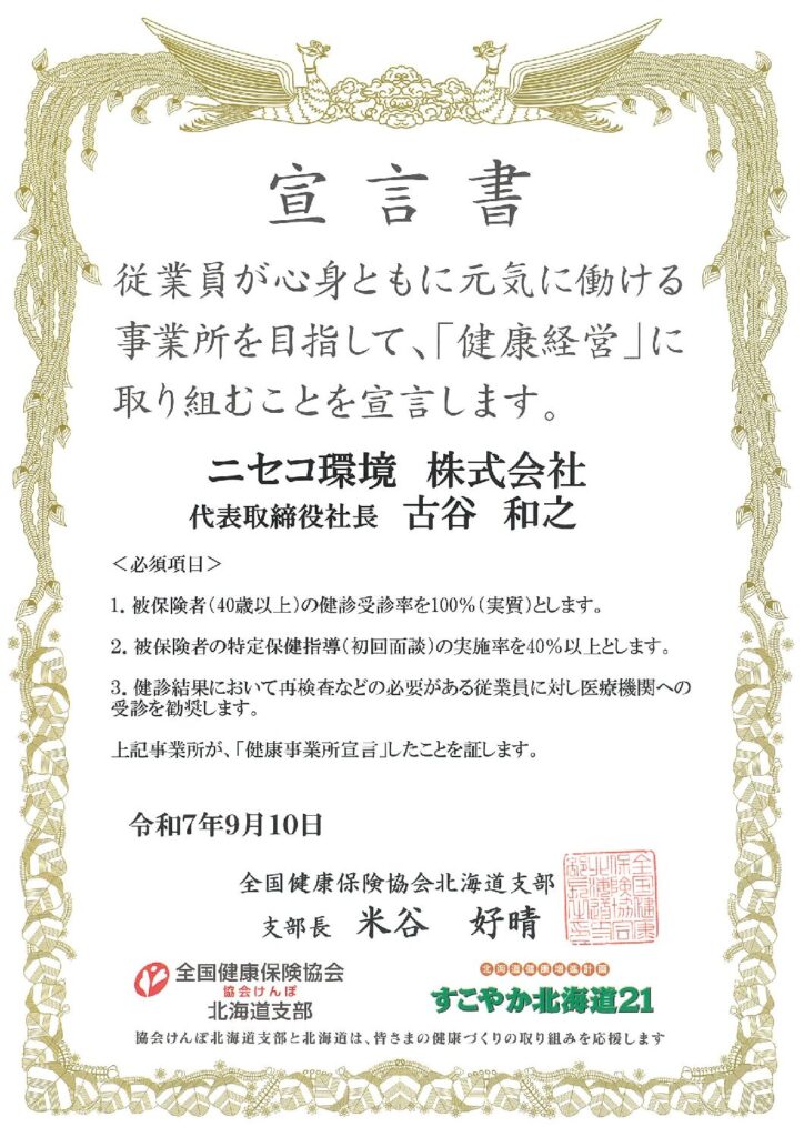 ニセコ環境は従業員が心身ともに元気に働ける事業所を目指して、「健康経営」に取り組むことを宣言し、令和7年9月10日付けで、「健康事業所宣言」として全国健康保険協会(協会けんぽ)北海道支部より認定を受けました。